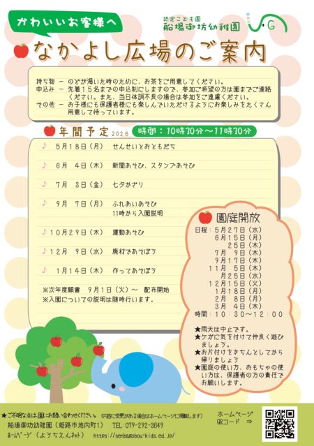 先着の申込制にしますので、参加ご希望の方は園(079-292-3649)までご連絡ください。また、当日体調不良の場合は参加をご遠慮ください。